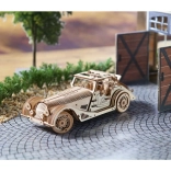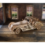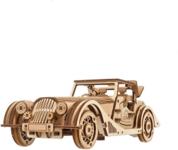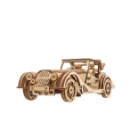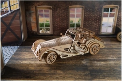 Modellen udmærker sig med et detaljeret interiør, åbnebare sidedøre, manuelt betjent fast tag med tagvindue og et funktionelt reservehjul i bagagerummet. Alt nødvendigt er inkluderet – delene er forskåret, og samlingen klares efter den illustrerede manual på 11 sprog. Behold det naturlige trælook, eller mal bilen efter din egen fantasi.