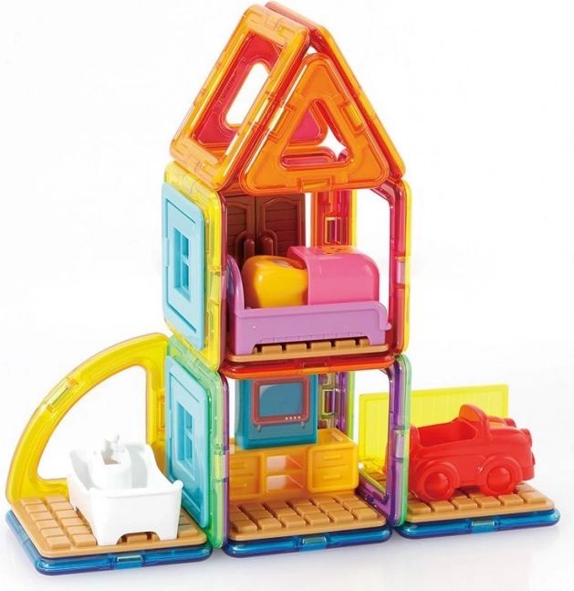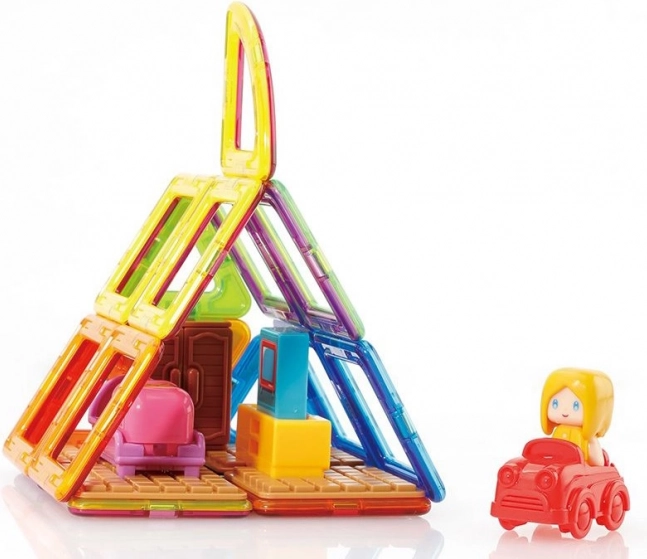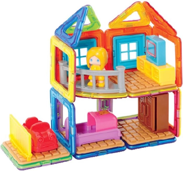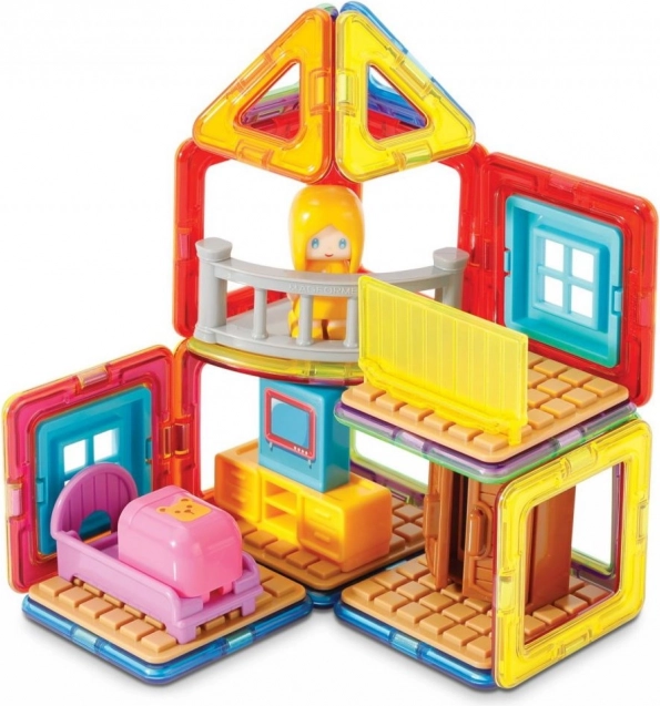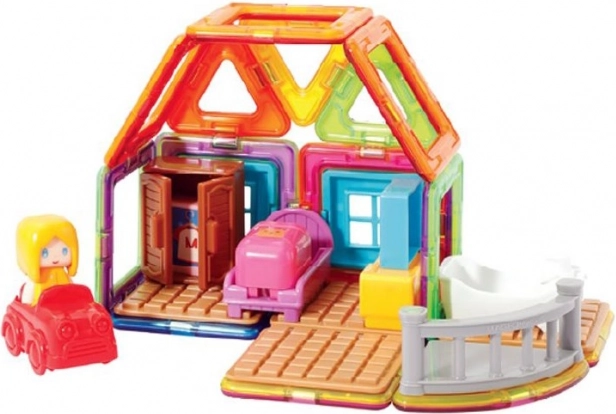 Mød Magda og se hendes lille hus. Det kreative magnetiske byggesæt gør det muligt at samle et stort antal tredimensionelle objekter ved hjælp af todimensionelle plastmangekanter. Magformers træner finmotorik, stimulerer kreativitet og lærer børn farver og grundlæggende geometriske former. Dimensionerne på delene og de velvalgte former sikrer den højest mulige legetøjssikkerhed. Materialet, som byggesættet er fremstillet af, opfylder de strengeste hygiejniske og sundhedsmæssige kriterier. Delene er tilstrækkeligt store, kan ikke sluges og er praktisk talt uknuselige. Pakken indeholder:
