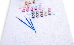Pakken indeholder lærred på ramme, 20-30 forskellige farver, 3 forskellige børster og kroge til ophængning.
