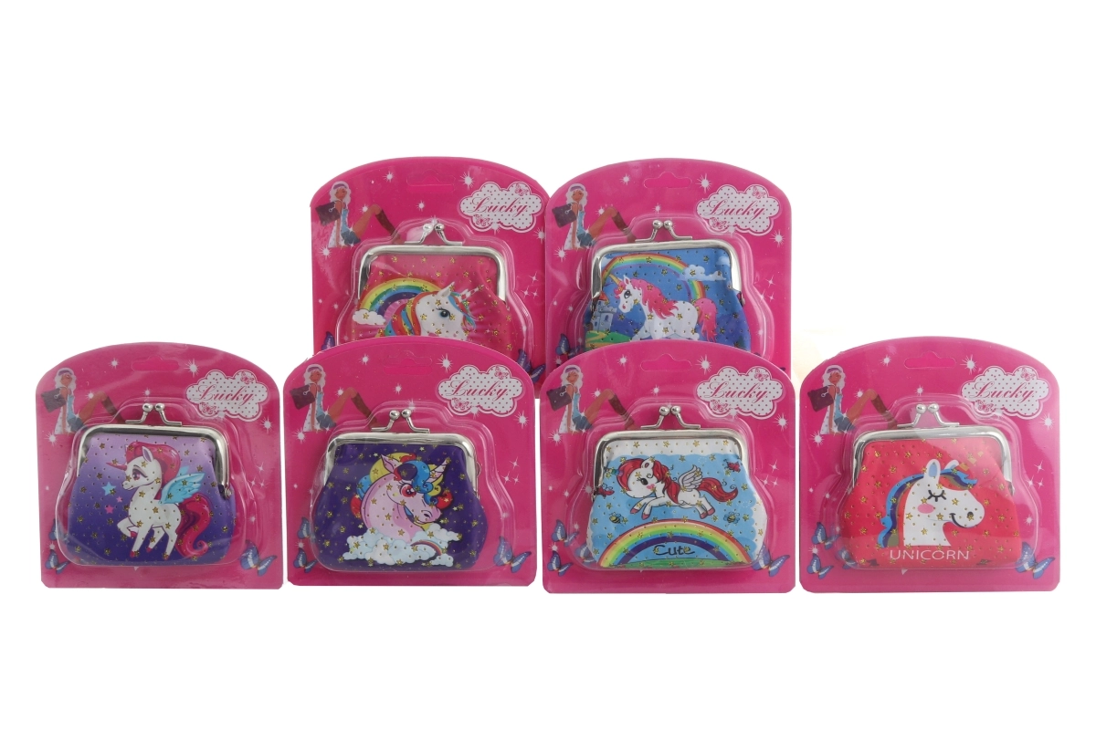 Pung med enhjørningemotiv – ideel til småmønter eller nøgler. Pung med ét rum og metal-lukning. Mål på pungen er 8,5 × 8 × 1,5 cm. Billedet er vejledende, levering sker efter aktuelt lager.
