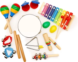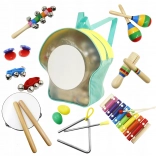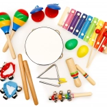 Dette alsidige ECOTOYS musiksæt tilbyder ti populære rytmeinstrumenter, som hele familien kan have det sjovt med. Børn opdager nye lyde, melodier og toner, udvikler hørelse og lærer at samarbejde ved fællesspil.