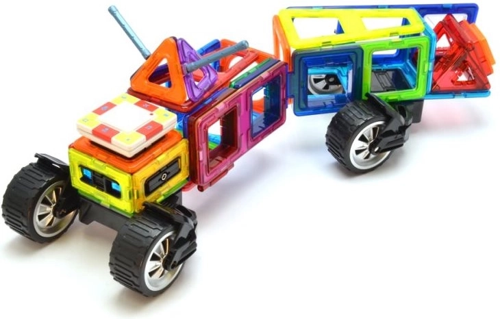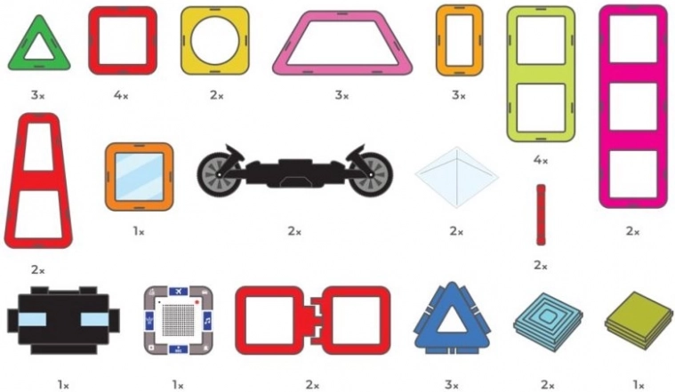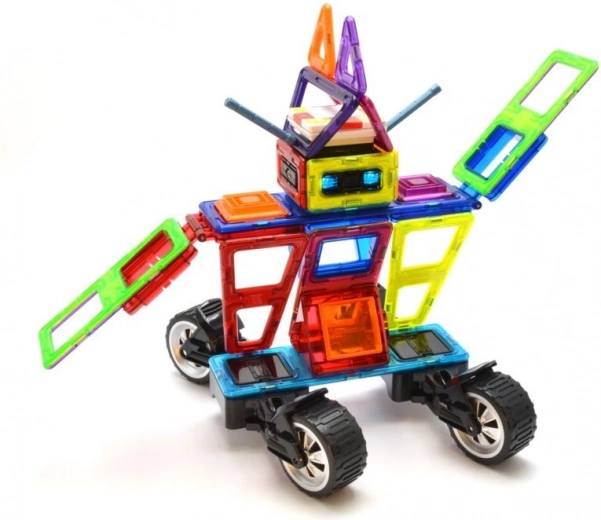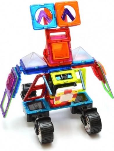 Boxen er ideel til at bygge kørende robotter med frit justerbare arme, men også motorcykler, trucks og trailere. Tre trekantede forlængere og et rigt sæt rektangler hjælper med at skabe stærke rammer i både højde og længde. Børn afprøver magnetiske forbindelser, udvikler fantasi, rumlig forståelse og finmotorik. Delene er sikre, robuste og kompatible med GEOMAG.