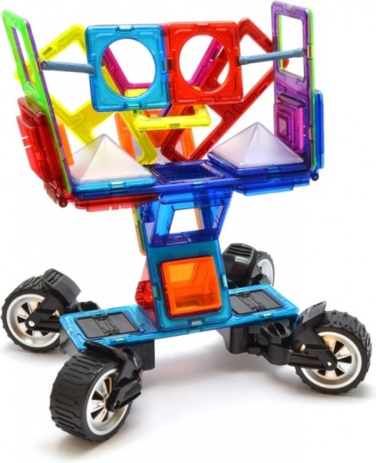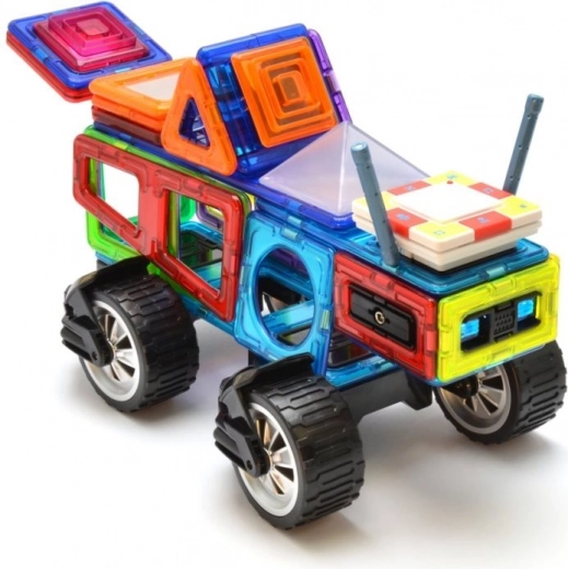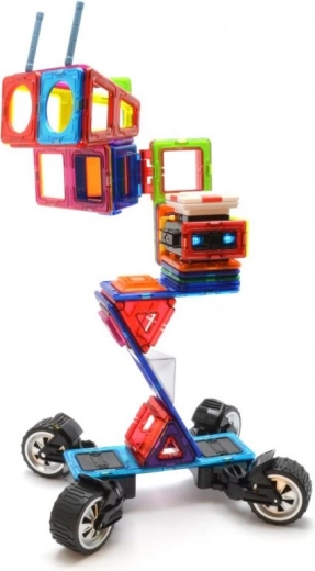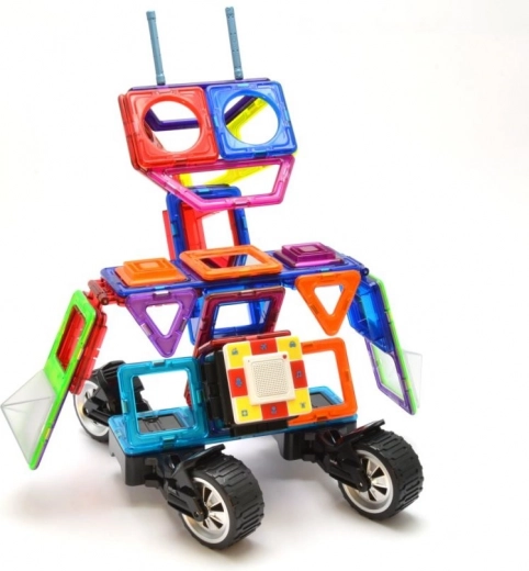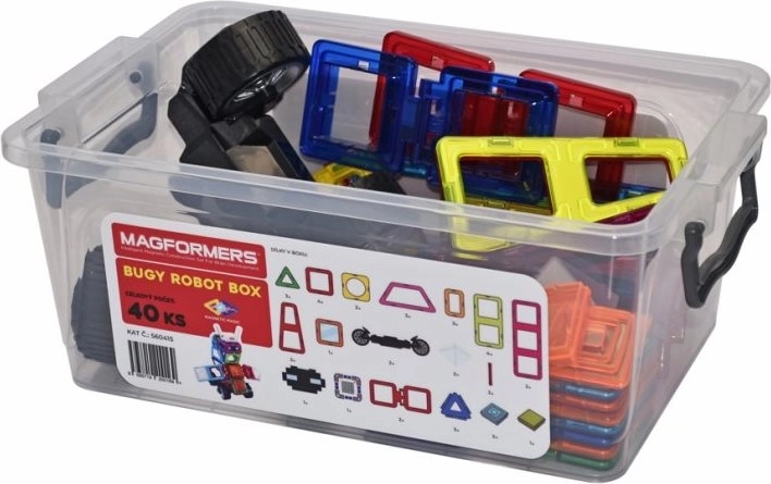 Oplev det kreative magnetiske byggesæt MAGFORMERS med 40 dele, og byg kørende robotter, buggyer, lastbiler og rumkøretøjer. Takket være magnetiske dele, drejelige chassiser og bonusmoduler (audiomodul og batteripakke) får du masser af lys- og lydeffekter. Brede hjul, justerbare arme med hængsler og kompatibilitet med GEOMAG udvider byggemulighederne og udvikler både kreativitet og finmotorik.