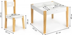 Perfekt sæt til dit barn, der med sin enkle form passer ind i et hvilket som helst børneværelse. Bordet har ben af fyrretræ, som sikrer stabilitet, og en MDF-plade, der er nem at vedligeholde og modstandsdygtig overfor skader.