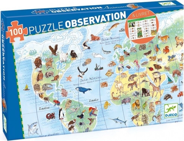 Opdag verden med DJECO Observationspuslespil, som forener glæden ved at lægge puslespil med at lære om naturen. På det store billede finder børn dyr fra alle kontinenter, og med den vedlagte brochure kan de udvide deres viden. Puslespillet med 100 brikker måler ca. 63 × 45 cm færdiglagt og styrker logisk tænkning, tålmodighed og finmotorik.