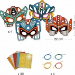 Indeholder alt, hvad du behøver: 4 forudskårne masker med selvklæbende zoner, 30 ark med metalliske detaljer, 4 elastikker og en tydelig trin for trin-vejledning. Perfekt til organiseret kreativ leg til fester, i klubber eller til en hyggelig familiefredag.