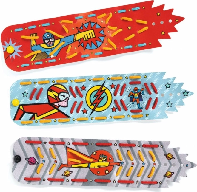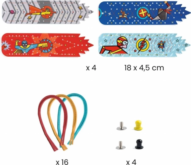 Lav din egen kollektion af superheltearmbånd med DJECO-sættet. Børn laver nemt op til 4 originale armbånd takket være forstansede dele, nem gennemføring af snore og trin-for-trin-vejledning. Materialer som ruskindssnore og syntetisk læder sikrer komfort og holdbarhed. En fantastisk kreativ aktivitet for børn og til leg sammen med venner.