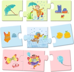 Puzzle Trio Min dag fra mærket DJECO er ideel til de første puslespil. Børn forbinder tre billeder, der tematik passer sammen, og genoplever samtidig dagens almindelige aktiviteter. Fra morgenvækning til puttetid – hvert sæt af tre skaber en enkel historie.