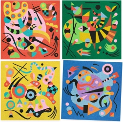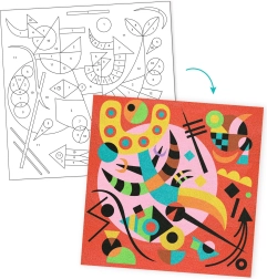 Dette kreative sæt byder på både sjov og læring i én pakke. Indeholder fire illustrerede kort, som børnene kan dekorere med hjælp fra tolv forskellige farvede sand. Sættet leveres med et plastværktøj og en detaljeret brochure, der giver trin for trin instruktioner til skabelsen. Børnene lærer om Wassily Kandinskys værker og teknikker uden at lave rod, da de arbejder i en lukket boks, hvilket hjælper med at holde sandet på plads.