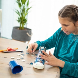 Under samlingen træner børn tålmodighed, logisk tænkning og finmotorik. Den færdige sneaker bliver til en holder til blyanter, farveblyanter og sakse, så glæden ved værket varer ved hver dag.
