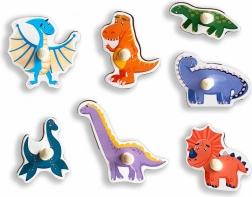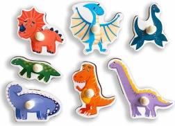 Farverigt træpuslespil med dinosaurer til de mindste, som støtter finmotorik, øje-hånd-koordination og genkendelse af former og farver. Syv brikker med praktiske greb lægges i præcist udfræsede huller på pladen, hvilket gør håndteringen lettere og udvikler både logisk tænkning og visuel hukommelse.