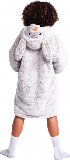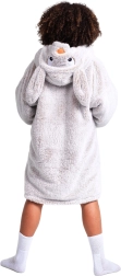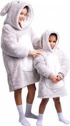 COZY NOXXIEZ tv-hættetæppe til børn med hætte formet som en kanin kombinerer tæppets hygge med en hættetrøjes bevægelsesfrihed. Det dobbelte lag – blød flannel udenpå og luftig sherpa-fleece indeni – holder dine børn dejligt varme, når de ser tv, leger eller slapper af. Den store hætte med ører og den rummelige lomme gør den både legesyg og funktionel til både inde og ude.