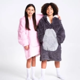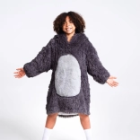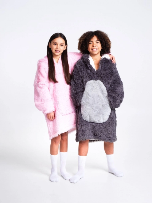 Sødt og praktisk varmt hoodie-tæppe til børn 7–12 år med dovendyrmotiv fra COZY NOXXIEZ. Forener komforten fra en hoodie og varmen fra et tæppe – superblød flannel og luftig sherpa-fleece for maksimal varme. Med stor hætte, kæmpe frontlomme og løs pasform for komfort både hjemme og ude.