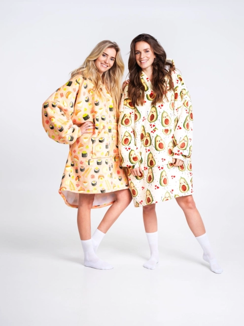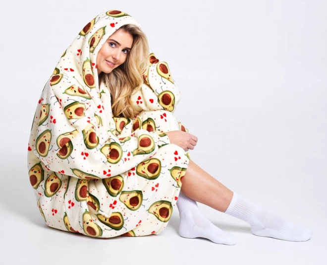 Nyd maksimal komfort med Cozy Noxxiez Avocado hoodie-tæppe – en kombination af hoodie og tæppe i ét. Indersiden er lavet af varm sherpa-fleece, og ydersiden af superblød flannel. Den rumlige hætte og den store frontlomme holder både hænder og hoved varme. Ideel til sofatid, arbejde ved PC, læsning og outdoor i køligere vejr.