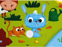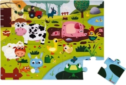 Børnepuslespil fra JANOD med motiv af dyr på gården. Nogle af brikkerne har en særlig overflade – en tekstur, der også kendetegner de rigtige dyr. Puslespillet udvikler børns logiske tænkning, opmærksomhed og hukommelse. Med puslespil lærer de at genkende farver, former og objekter, finmotorikken styrkes, og børnene lærer at forstå forholdet mellem del og helhed. Takket være de særlige dele på puslespillet lærer børnene gennem berøring at skelne mellem forskellige overflader. Mål på det færdigsamlede puslespil: ca. 65 × 50 cm