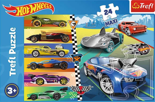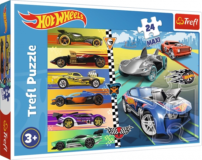 Puslespil 24 MAXI med HOT WHEELS-motiv. Store brikker, størrelse 60×40 cm, kalandreret papir for mindre genskin. Kvalitets- og miljøvenlig udførelse til børn.