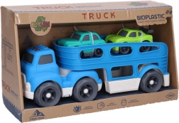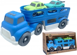 Autotrailer til transport af biler med en længde på 30 cm og to små biler med en størrelse på 9 cm. Denne model med frit drejelige hjul er ideel til små bilentusiaster.