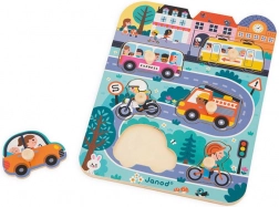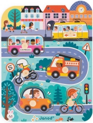 Træpuslespillet I byen fra det franske mærke Janod er det ideelle legetøj til de mindste. Det omfatter forskellige transportmidler, som barnet let kan gribe takket være de særlige knopper, hvilket understøtter udviklingen af finmotorikken.