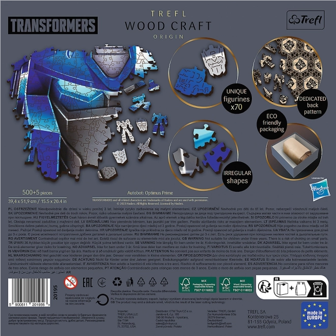 Oplev de premium dobbeltsidede træpuslespil fra TREFLs Wood Craft Origin-serie med motiv af TRANSFORMERS OPTIMUS PRIME. Takket være laserpræcision, stærk træfiberplade og specialformede brikker får du en sjov pusleoplevelse med smukt glatte kanter. Puslespillet er dobbeltsidet – billede på den ene side, elegant mønster på den anden – og leveres desuden i miljøvenlig, plastikfri emballage.