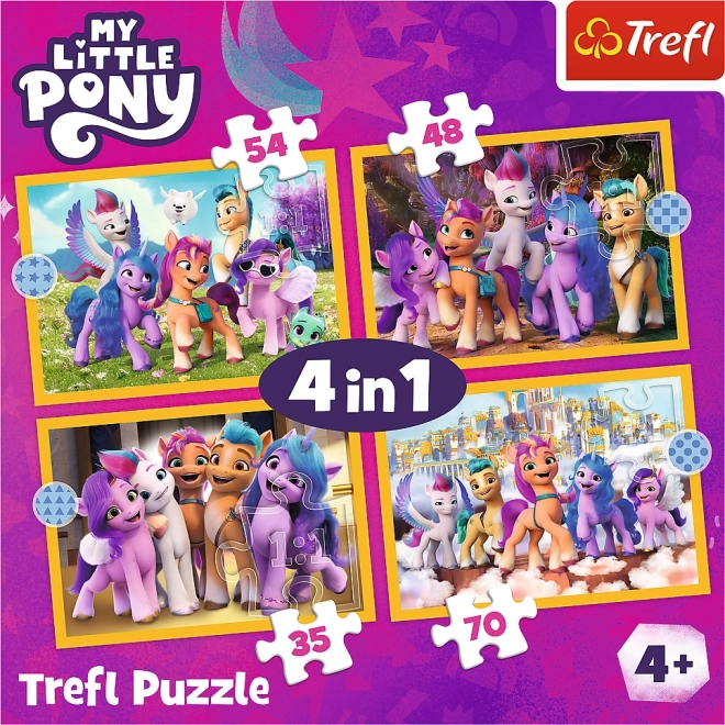 Farverigt sæt 4 i 1 puslespil med motiver fra MY LITTLE PONY, som vil glæde små puslespilsfans. Fire separate billeder i størrelsen 285 × 205 mm og forskelligt antal brikker (35, 48, 54, 70) giver både sjov og gradvis udfordring. Fremstillet i Polen af miljøvenlige materialer, egnet til børn fra 4 år.