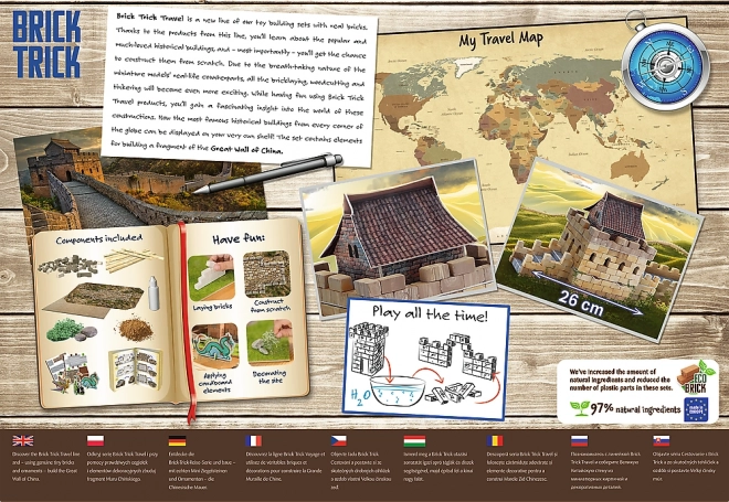 Oplev skønheden og historien bag et af verdens mest berømte monumenter. Med Brick Trick Travel-serien bygger du Den Kinesiske Mur fra bunden og skaber trin for trin en imponerende model af ægte lersten og træelementer. Med de medfølgende dekorationer og klistermærker opnår du et autentisk udseende.