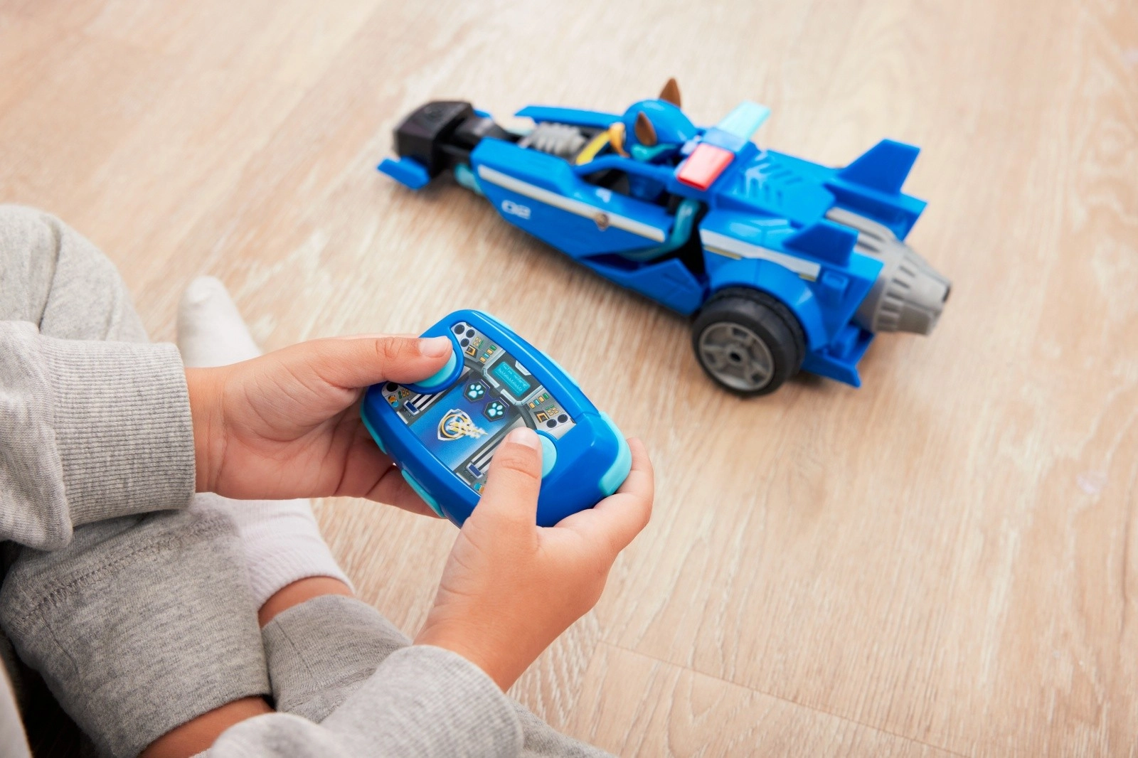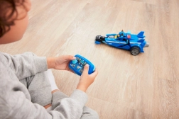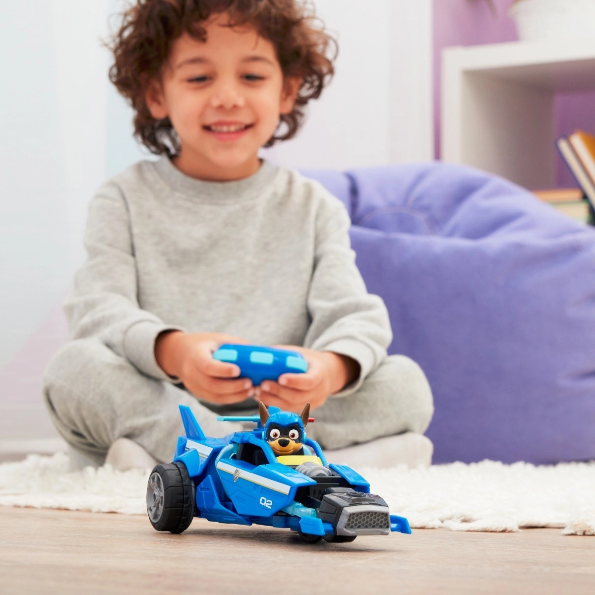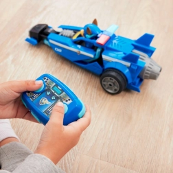 Oplev filmaction fra Paw Patrol med Chases blå politibil med 2,4 GHz fjernstyring. Børn kan nemt køre fremad og lave 180° vendinger takket være fjernbetjening med to knapper. Bilen har store baghjul, aerodynamiske “finner”, nummer 02 og en detaljeret kabine med Chase-figur.