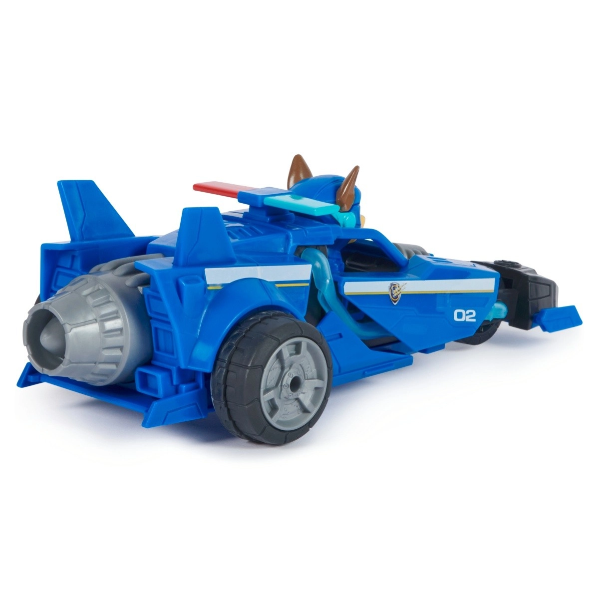 Detaljeret politibil med nummer 02, aerodynamiske elementer og Chase-figur – præcis som i Paw Patrol: The Mighty Movie.