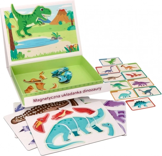 Opdag et magnetisk puslespil med dinosaurer i en praktisk foldbar æske med håndtag, som giver børn kreativ og sjov læring både hjemme og på farten. Sættet indeholder 51 magnetiske brikker og 10 farvede kort med dinosaurarter – ideelt til udvikling af finmotorik, hånd–øje-koordination og logisk tænkning.