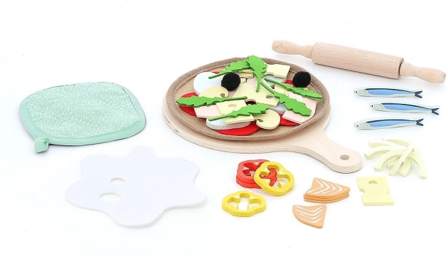 Giv små kokke en autentisk pizzaoplevelse. Træsættet indeholder alt, hvad der skal til for at “bage” den perfekte pizza – fra dej og underlag til farverige toppings. De naturlige materialer gør legen sikker, robust og taktilt spændende.