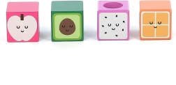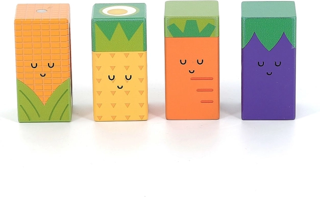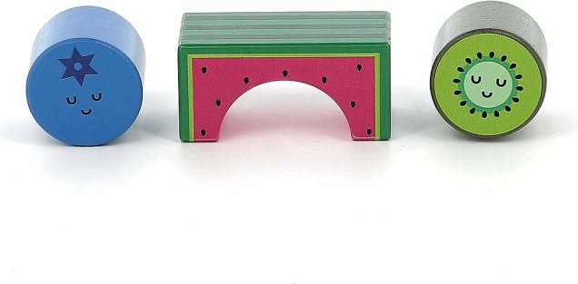 Dette originale sæt med 11 træ-lydklodser med glade frugtmotiver giver børn masser af input til udforskning. Hver klods er unik – når den rystes eller bankes, udsender den forskellige lyde, som understøtter sanseudvikling og nysgerrighed. Takket være den kompakte størrelse ligger klodserne godt i små hænder og er ideelle til de første byggelege, sortering og fri leg.
