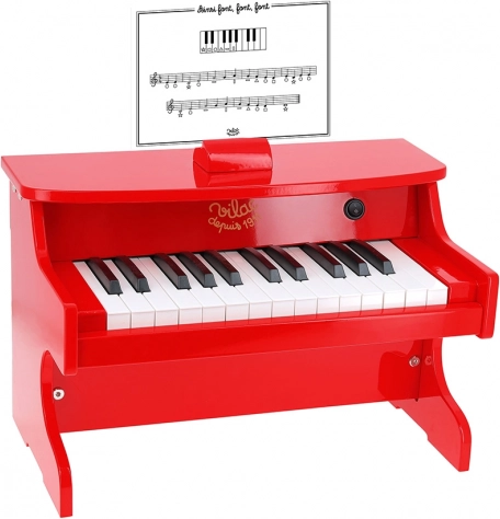 Opdag musikkens magi med det røde børneklaver fra VILAC. Et elegant klaver i træ med 18 tangenter og en 10-siders nodebog udvikler rytme, gehør og kreativitet. Kører på batterier og tilbyder automatisk slukning efter nogle minutters inaktivitet. Et fremragende valg til de første musikalske skridt – robust udførelse, smuk lyd og spilleglæde.