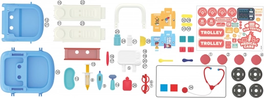 - Indeholder forskellige medicinske redskaber, der lader børnene efterligne rigtige medicinske procedurer.