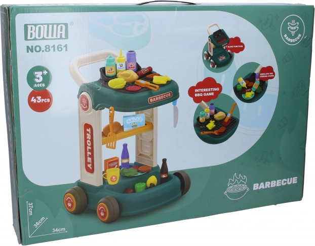 - Komplet sæt: vogn med hjul, madvarer, service og grilltilbehør