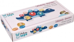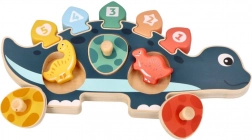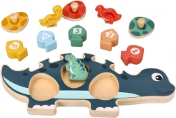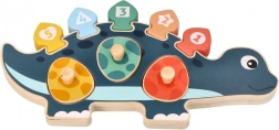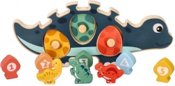 Træpuslespil til børn i form af en dinosaur med farvede, nummererede brikker er ideelt til at udvikle motorik og tidlige regnefærdigheder hos børn fra 12 måneder.
