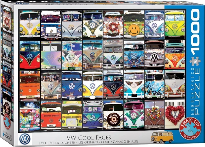 EUROGRAPHICS VW Cool Faces er pakket i en kompakt kvadratisk æske, som sparer plads og er ideel til opbevaring og transport. Det, der adskiller dette puslespil, er dets originale stansning. Brikkerne har ikke standardformer, hvilket øger den samlede sværhedsgrad og giver en ny spiloplevelse.