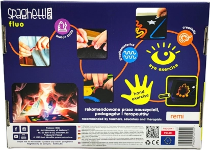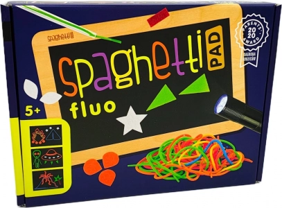 Oplev Spaghetti Fluo – et smart kreativt sæt, der kombinerer fluorescerende effekter, farvede velcrosnore og en LED-lygte med fluorescerende tusch. Børn træner finmotorik, øje–hånd-koordination og korrekt blyantsgreb, mens de skaber fantasifulde billeder på de medfølgende skabeloner.