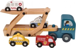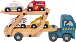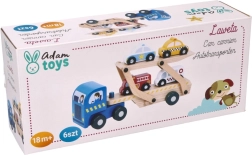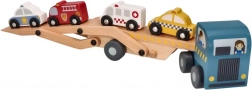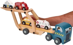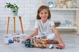 Dette træautotransporter tilbyder fantastisk sjov for børn takket være dets variation og kvalitetsforarbejdning. Det inkluderer et aftageligt anhængertræk, der kan holde fire charmerende farvede træbiler.