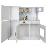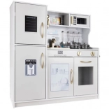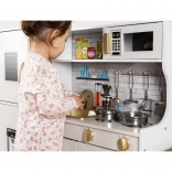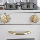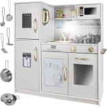 Dette XL træ-legekøkken er skabt til mange timers sjov. Den integrerede LED-belysning kan placeres under overskabet, i skabet eller i ovnen, og de drejelige kontakter med klik giver fornemmelsen af ægte madlavning. Den robuste MDF-konstruktion og det elegante hvid-guld design bliver et smukt indslag i børneværelset.