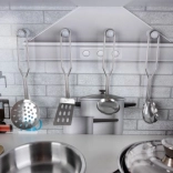 Gryde, pande med låg og fire køkkenredskaber (øse, spaghetti-ske, hulske, tang/ske) motiverer til øjeblikkelig madlavning og leg som køkkenchef.
