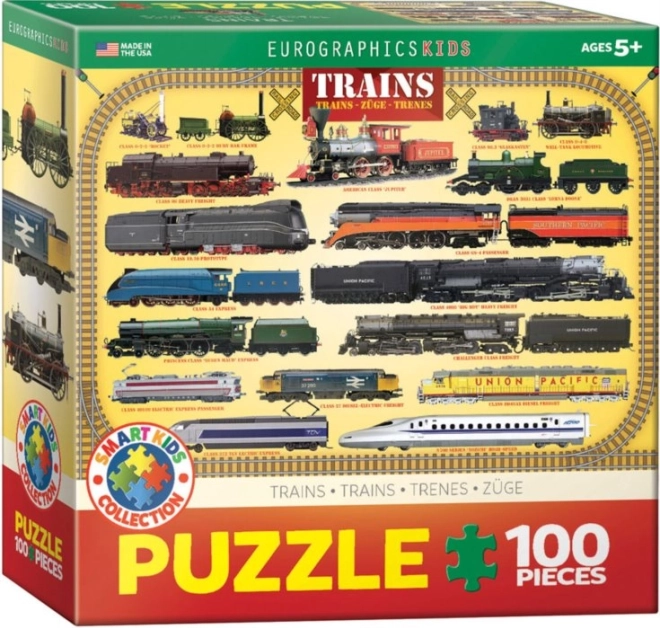 Oplev et sjovt og lærerigt puslespil med togmotiv fra EUROGRAPHICS, ideelt til børn fra 5 år. Puslespillet med 100 brikker udvikler finmotorik, logisk tænkning og tålmodighed. Teksterne på puslespillet er på engelsk, og det færdige motiv måler ca. 48,3 × 33 cm.