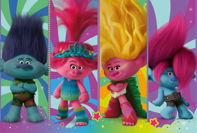 Børnepuslespil Trefl Trolls, 104 brikker, større brikker Super Shape XL. Farverigt motiv, størrelse samlet ca. 60 × 40 cm. Sjov underholdning og udvikling af færdigheder.