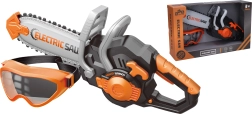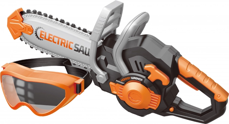 Beskyttelsesbrillerne sikrer sikkerhed under legen. Knappen på venstre side muliggør nem aktivering af saven, hvilket bidrager til en realistisk legeoplevelse.