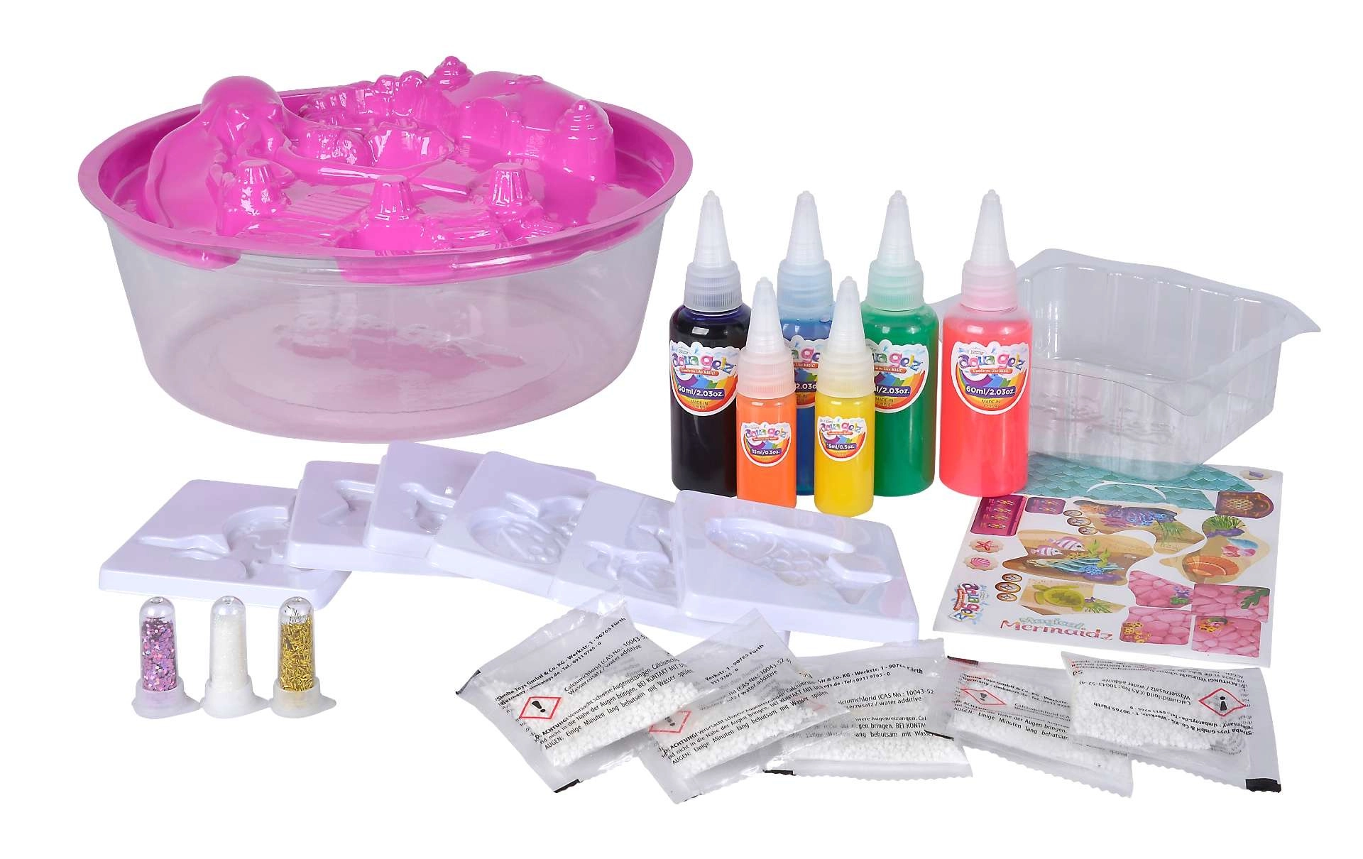 Sættet Aqua Gelz Magiske havfruer giver børn endeløs sjov ved vandet og ved bordet. Med en speciel opløsning og farvede geler skaber de på få øjeblikke 3D-figurer af havets væsner og havfruer. Takket være den enkle fremgangsmåde og præcise applikationsflasker er det let, rent og engagerende at skabe.