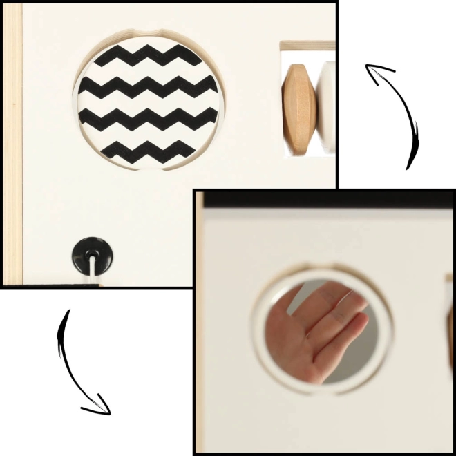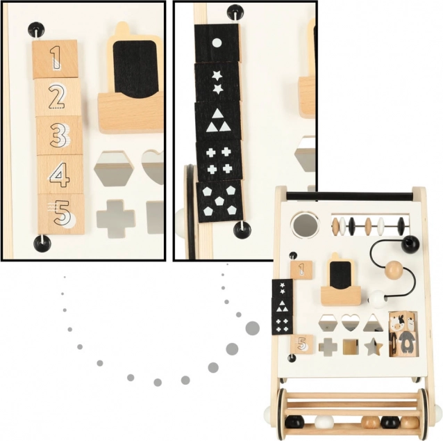 Den træbaserede konstruktion og minimalistiske design giver interaktive oplevelser og lærer grundlæggende koncepter for geometri og tal.