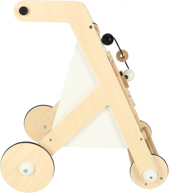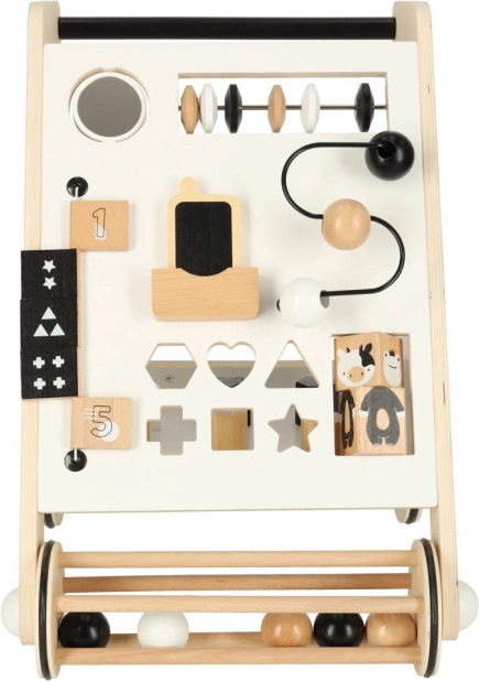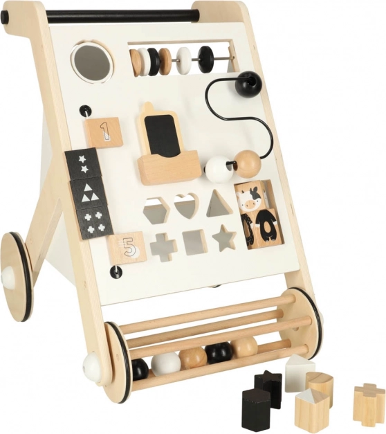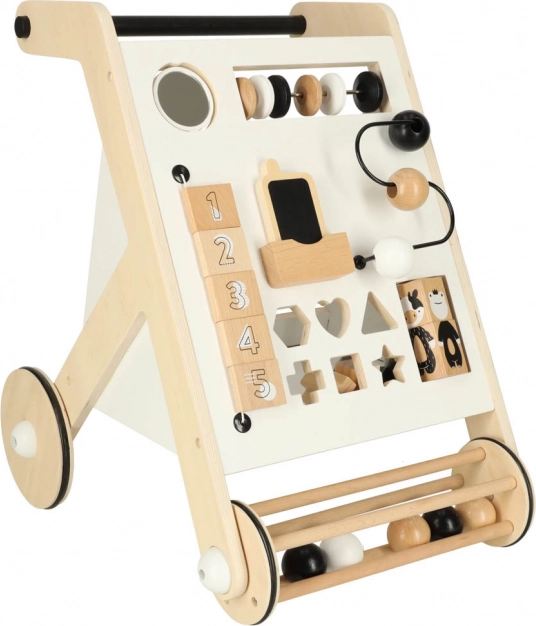 Gangstolen indeholder skydende kugler, formsortering og roterende blokke, som støtter finmotorik og koordination.