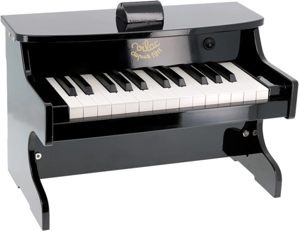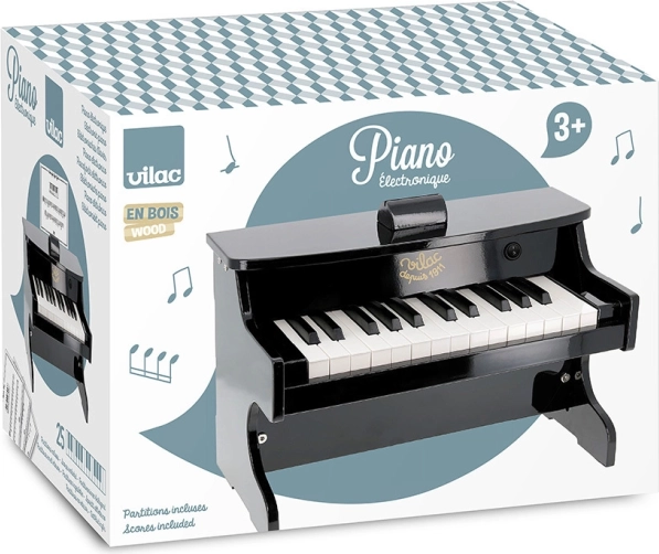 Stilfuldt elektronisk børneklaver fra VILAC i sort farve vil glæde små musikere fra 3 år. Det byder på 18 tangenter, et medfølgende nodehæfte (10 sider), en holdbar trækonstruktion og praktisk automatisk slukning. Drives af batterier, som ikke medfølger.