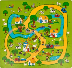 Opdag den sjove skummåtte med temaet livet på landet, som skaber et sikkert og stimulerende rum for dine børn. Du samler en kvadratisk legeflade med veje, små søer, træer, bygninger, en vindmølle, dyr, køretøjer og figurer – perfekte kulisser til leg med figurer.