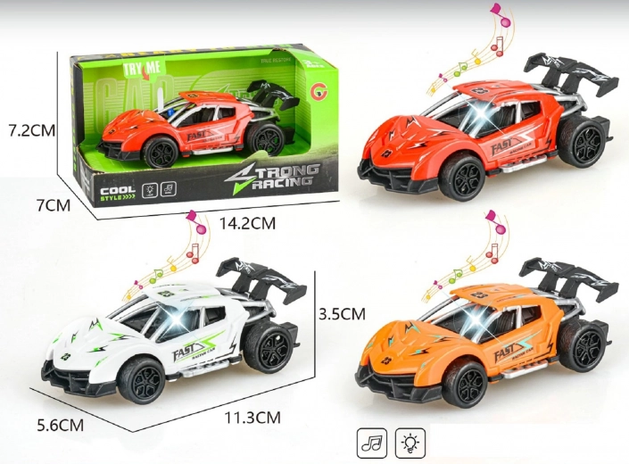 Det kompakte legetøjsracerbil med pull-back-mekanisme glæder både små og store fans af fart. Den tilbyder lys- og lydeffekter, aktiveret med en knap i kabinen, er klar til kørsel inklusive batterier og fås i tre farvevarianter.