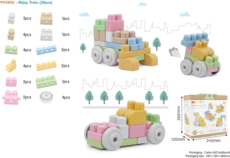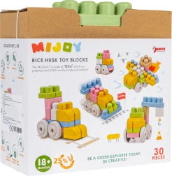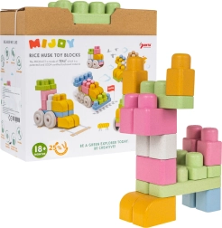 Et sæt konstruktionsklodser til de mindste fra en miljøvenlig serie, designet til at reducere brugen af plast. Klodserne er lavet med 25% biobaseret materiale fra affald af risskaller. De har afrundede kanter, forskellige former og pastelfarver. Sættet består af 30 dele og gør det muligt at bygge forskellige konstruktioner, hvilket positivt påvirker barnets udvikling, styrker rumlig forståelse og motoriske færdigheder samt fremmer kreativitet.