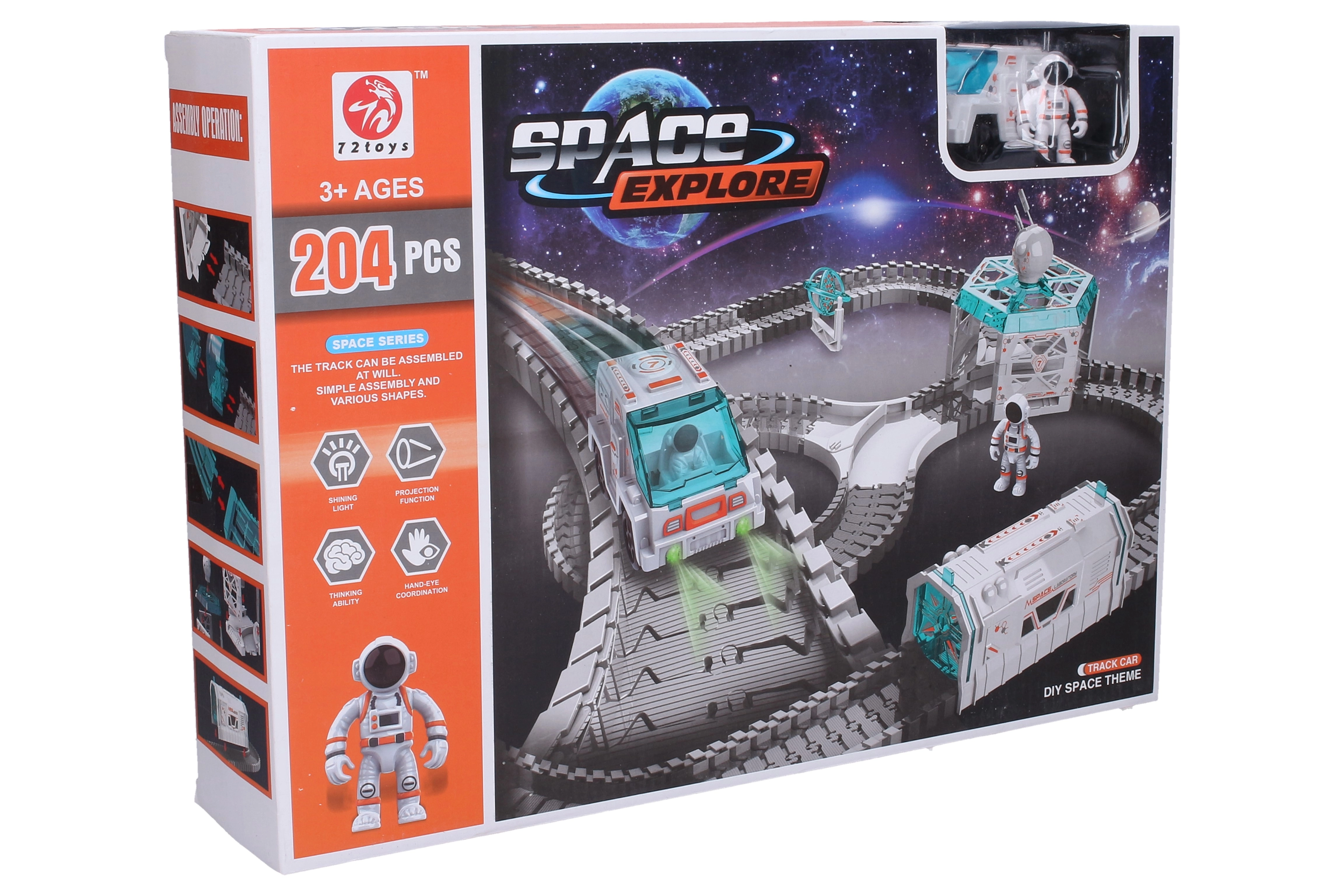 Udforsk eventyr i rummet med denne kosmiske racerbane i målene 85 × 75 × 32 cm. Sættet inkluderer en bil, en astronautfigur og en fungerende projektor med lyseffekter. Banen kan frit samles i forskellige former, så legen aldrig stopper.